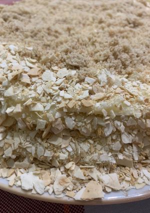 - З кожного листа лаваша вирізаємо (за допомогою тарілки діаметром 20 см) заготовки. Це будуть "коржі" для торта. Я підсушувала їх в духовці на деко з пергаментом. Але це можна зробити на сухій пательні на середньому вогні. Робимо так з 5 заготовками. Обрізки лаваша підсушуємо трохи більше.Їх подрібнюємо ще гарячими в крихту качалкою.
