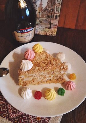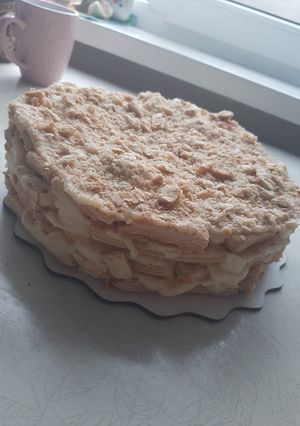 - У готовий крем вимакуємо кожен шматочок печива «Вушки». І викладаємо в круглу роз’ємну форму діаметром 20 см.Таким чином викладаємо близько 6-7 шарів печива в кремі. Чим краще ви змажете печиво кремом, тим соковитіше і смачніше вийде торт.Коли ми виклали всі шари печива в кремі, можемо прибирати бічну частину рознімної форми.
