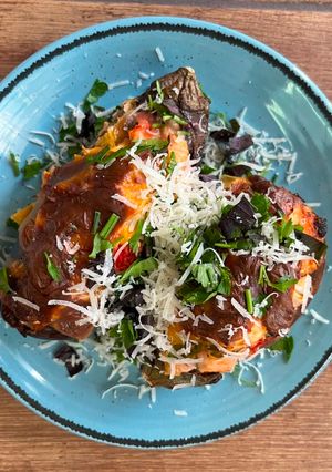 - Викласти у банки шарами: обсмажені баклажани, заправку і так далі. Накрити кришками (не закривати), стерилізувати 0,5 банку – 40 хв; 1 л банку – 1 годину після закипання. Для цього на дно каструлі (великої миски) покласти тканину, щоб банки не вибухнули, на неї поставити банки, залити водою (не до верху кришки, врахувати, що під час кипіння вода буде підійматися і може потрапити у банку). Після стерилізації закрутити банки, перевернути, охолодити.