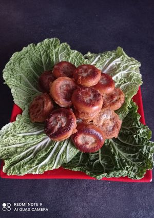 - За допомогою чайної ложки начиняємо бублики начинкою. Випікаємо 10-15 хв.до рум' яної скоринки.Обережно переносимо "ялинку" на блюдо. Прикрашаємо краплями кетчупа.